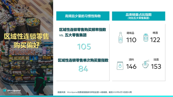 消费者的购物篮里都藏着明显的“偏好信号”。Worldpanel消费者指数家庭样组的数据显示,在截至2025年6月13日的52周,对比全国前五的零售集团(沃尔玛集团、高鑫零售集团、永辉超市公司、华润集团、物美集团),区域性连锁零售的快消品购买频率指数达105,单次购买量指数为84,匹配了该渠道目前习惯性多频但少量的购买行为。这反映在区域性连锁零售的近场的优势,以及对调味品、挂面、汤料、啤酒等购买频次较高的品类的偏好,这些品类的销量贡献比全国前五零售商更为突出。