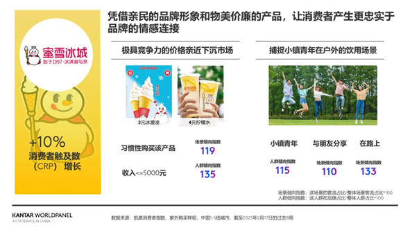 从消费人群来看,春节期间蜜雪冰城成功抓住了小镇青年这一核心客群,他们通常会购买蜜雪冰城在路上边走边喝,并与朋友共同分享,这一消费习惯有力支撑了品牌在下线城市的市场地位。