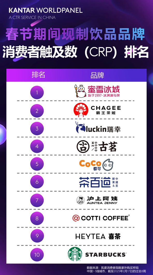 2025年春节作为中国首个"非遗年",八天的黄金假期叠加消费券政策,带动了消费者乐享假日的情绪。凯度消费者指数家外消费样组的最新研究显示,2025年春节期间(截至到2025年2月17日的过去8周)中国现制饮品市场持稳步增长,消费者触及数(CRP)对比去年同期增长5%。