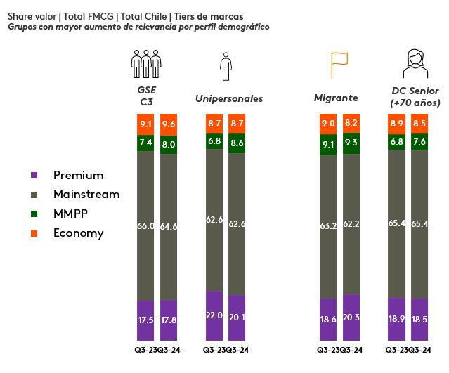 A pesar del escenario desafinate, el consumidor chileno demuestra resiliencia, adaptándose y buscando alternativas que les permitan ahorrar. A pesar de que, la disminución del consumo afecta a todos los tiers de marcas, el impacto es menor en las marcas económicas y propias, estas últimas están ganando relevancia especialmente entre los segmentos emergentes de la población, como en los hogares unipersonales y hogares seniors.