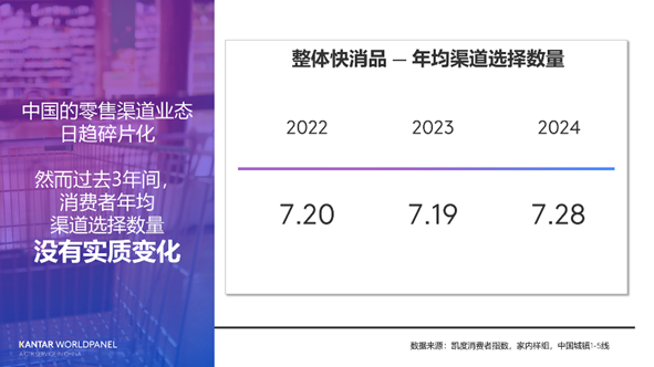 凯度消费者指数的研究表明,尽管新兴渠道(如会员店、即时零售、社区团购)快速增长,消费者实际产生购买的渠道数量并未同步增加。这意味着新兴渠道更多是分流了传统渠道的份额,而非创造纯粹的增量。例如,2024年会员店、零食店渠道实现了展店、营收双丰收,而大卖场的份额相应收窄,抖音电商增长迅猛的同时,整体线上增速疲软。