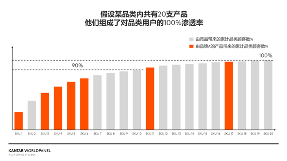 从图中可以清晰地看出,10支核心产品已经覆盖了90%的品类用户需求,而剩余的10支产品仅能够吸引额外10%的增量用户,其中包括品牌A的2支产品。如果品牌A优化这2支低效产品,释放出相应的资源,重新投入到核心产品和新品上,那么品牌的市场竞争力将获得提升。