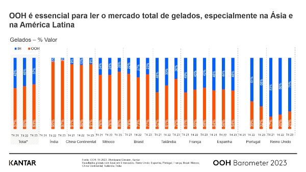 As ocasiões OOH são vitais para o desempenho da categoria de gelados, contribuindo com 63% do gasto total. Isto é especialmente verdade na Ásia e na América Latina: na Índia, 97% de todo o valor é gerado em OOH e o valor é de 80% no México. A proporção é mais baixa no Reino Unido (25%). As vendas de gelados OOH estão a aumentar em quase todos os mercados, com exceção de Portugal e da Tailândia. A notícia positiva é que o crescimento do OOH não se deu à custa das vendas no domicílio: os gastos também estão a crescer nesse ambiente.