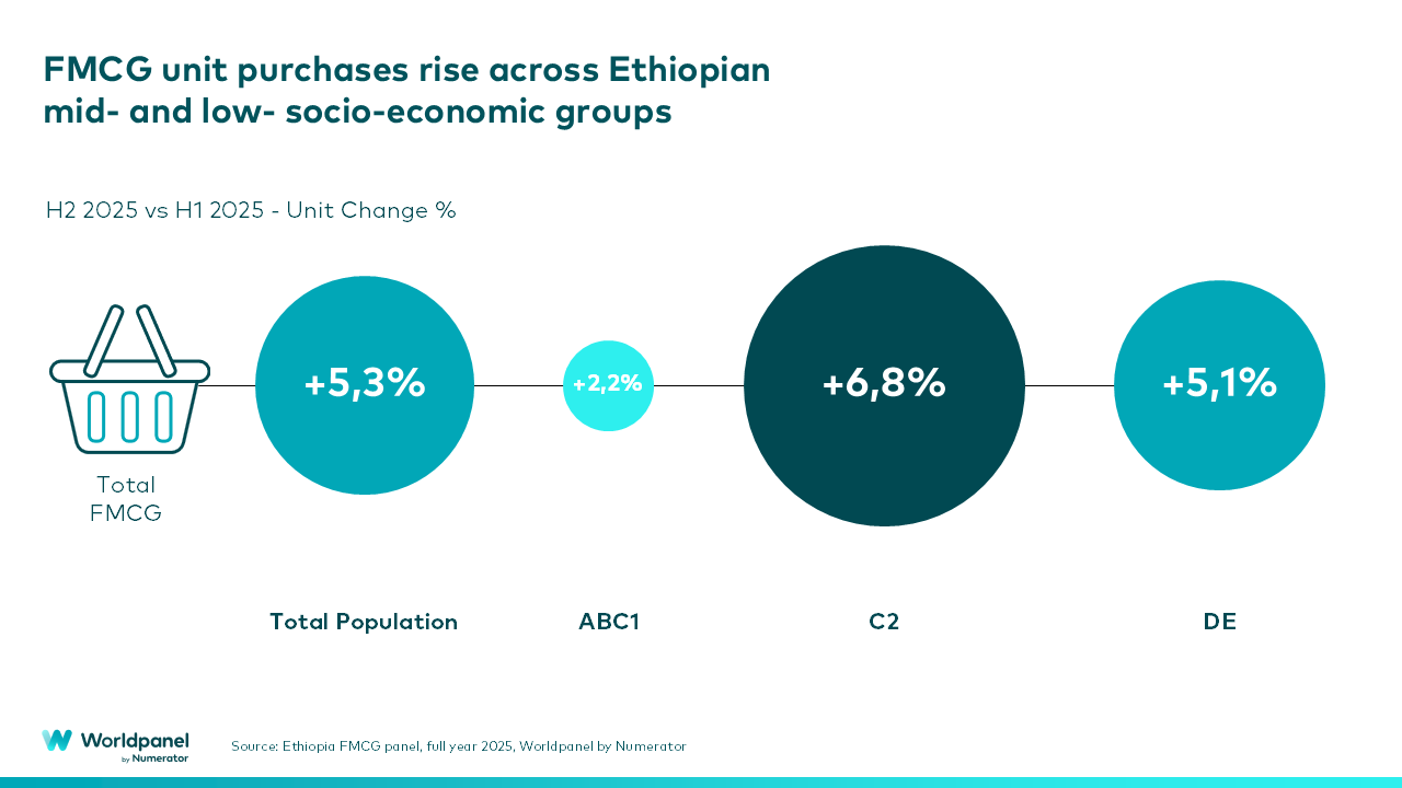 Data from our consumer panel indicates that Ethiopian shoppers are buying more FMCG units overall, with growth visible across all socioeconomic groups, and particularly pronounced among mid and lower income households.