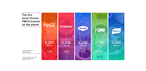 Les 5 marques leaders et les plus choisies au monde sont Coca-Cola, Colgate, Maggi, OMO et Knorr. Coca-Cola règne en maître et consolide son statut de marque la plus choisie au monde, avec un impressionnant résultat de 8,3 milliards de CRP (Consumer Reach Points, indicateur basé sur le taux de pénétration et la fréquence d'achats). Pour sa part, Colgate constitue une référence en matière de pénétration mondiale, étant la seule marque de produits de consommation achetée par plus de la moitié de la population, avec un taux de pénétration de 55,9 %.