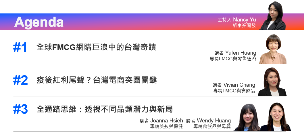 在本次研討會中,您將獲得以下FMCG消費行為趨勢線索: