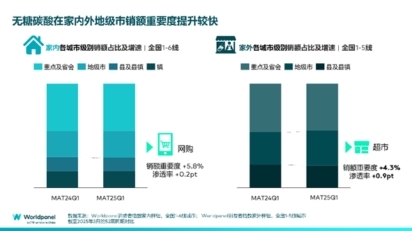 虽然无糖碳酸的主力消费者仍在重点及省会城市,但值得注意的是,无论是在家内还是家外,无糖碳酸在地级市的销额重要度都在升高。截至2025年第一季度的52周,家外地级市销额占比同比提升0.7个百分点,家内地级市销额占比同比提升1.9个百分点,且2025年第一季度无糖碳酸在家内的增长主要受地级市驱动。