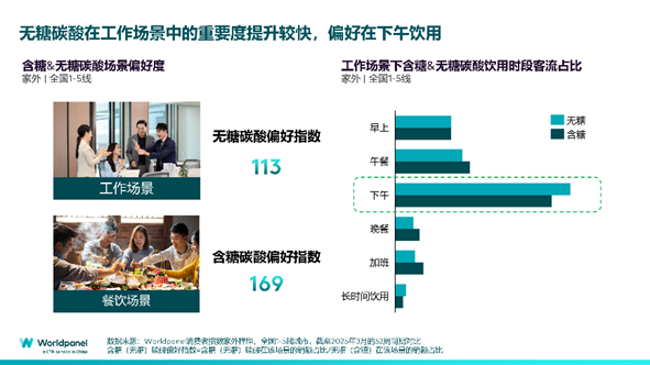 在所有的家外饮用场景中,无糖碳酸在工作场景的重要度提升最快,销额占比同比提升1个百分点,且不同于含糖碳酸适配的佐餐场景,无糖碳酸更偏好在工作场景饮用。而切入到工作场景,可以看到无糖碳酸客流占比最大的饮用时段为下午。碳酸饮料自带的刺激气泡感加之无糖配方,可以满足上班族下午轻负担提神的需求。