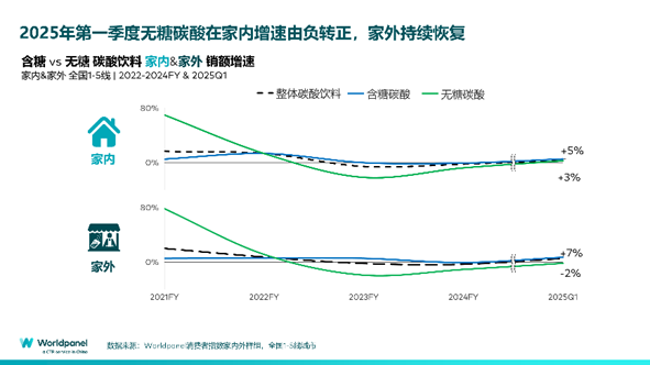 经历了两年的市场下跌后,无糖碳酸在2025年第一季度,迎来了开门红。其在家内消费重回正增长,家外消费持续复苏。