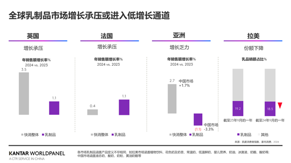 第二组数据显示,在座的各位想必都深有体会,全球乳制品行业当前确实面临挑战。我们看到,无论是消费价值观、家庭结构还是消费者购买行为,在疫情后都发生了显著变化。实际上,乳制品在各个区域的增长都非常缓慢,要么面临增长压力,要么已经出现下滑趋势。