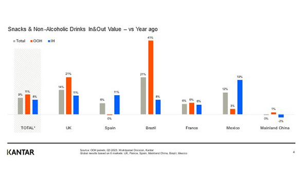 Même au Brésil, où le hors domicile a enregistré une croissance de 41 % au troisième trimestre 2023 par rapport à la même période en 2022, les hausses de prix ne représentent que 45 % de cette croissance totale ; le principal contributeur est la reprise des sorties effectuées et du nombre d'unités achetées par sortie.