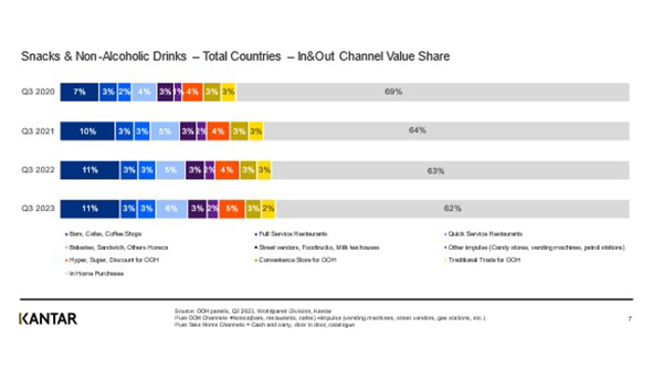 Cependant, malgré ces performances solides et en amélioration constante, l’équilibre entre les ventes hors domicile et les ventes à domicile de produits de snacking et de boissons n’a pas encore tout à fait retrouvé son niveau d’avant la pandémie. Les achats OOH contribuent aujourd'hui à 38 % de la valeur totale du marché, alors qu'au troisième trimestre 2019, ce chiffre était de 41 %.
