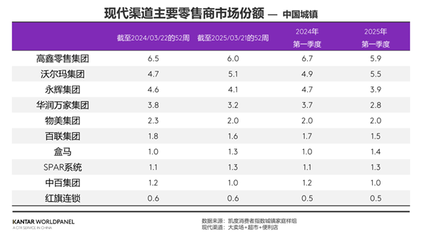 在前十零售商中,沃尔玛集团、SPAR系统以及盒马在现代渠道的市场份额有所提升。