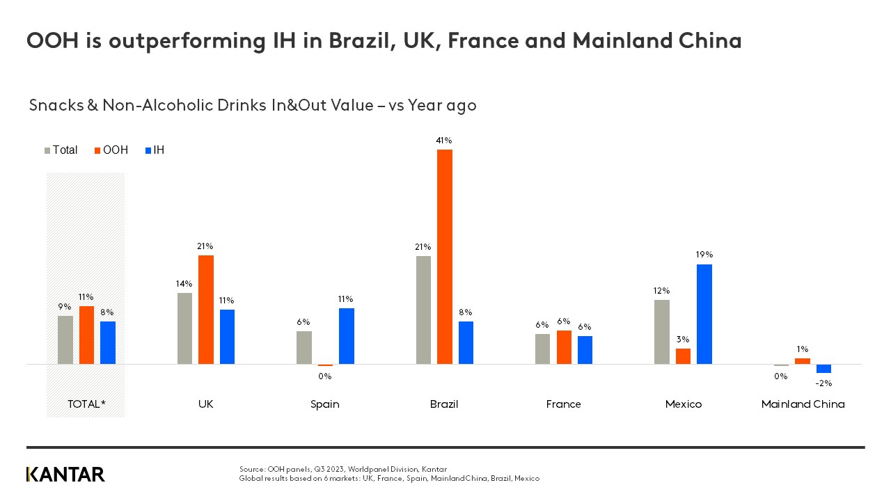 Looking at the big picture, total spend on snacks and non-alcoholic drinks across both the out-of-home (OOH) and in-home (IH) spheres has grown once again, for the tenth quarter in a row, with a 9% year-on-year increase.