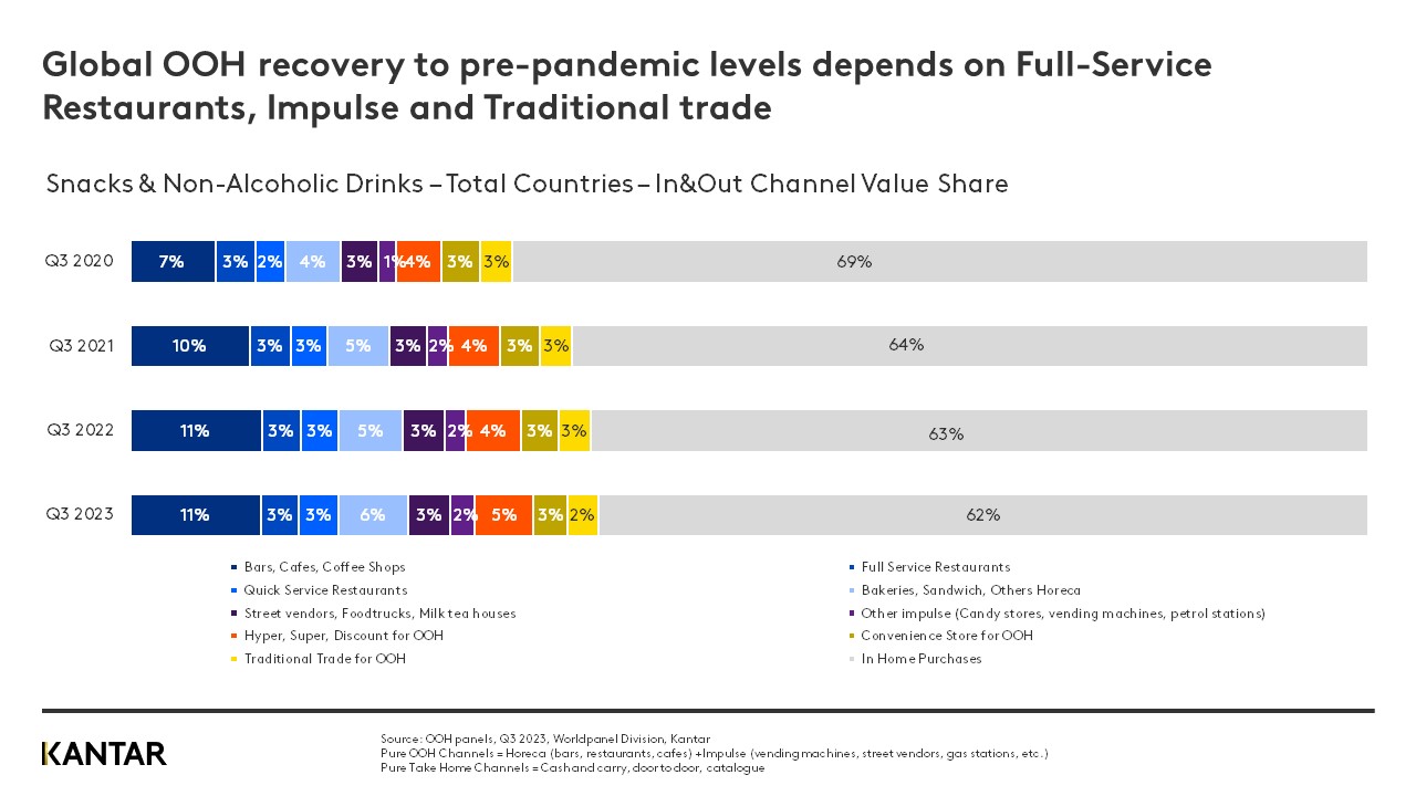 However, despite this strong – and continually strengthening – performance, the balance between OOH and in-home sales of snacks and drinks has still not quite righted itself to pre-pandemic levels. OOH purchases today contribute 38% of the total market value, whereas in Q3 of 2019 the figure was 41%.