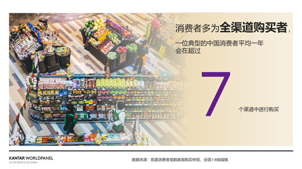 在当今中国的快消品零售市场,绝大多数消费者都是全渠道消费者。根据凯度消费者指数家庭样组数据显示,一个典型中国消费者每年在超过7个购物渠道购买过快消品。
