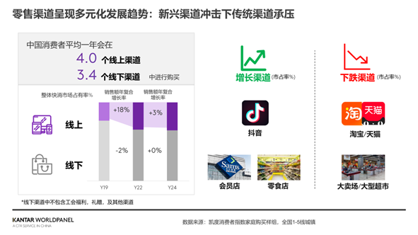 在消费者的全渠道购物行为背后,线上线下双轨并行深度演化。自2019年以来,整体线上持续裂变生长,消费者在一年内购买过快消品的电商平台的平均数量突破4个,线下渠道平均数量保持3个以上。在这平均7个渠道的数字背后,传统电商及线下商超承压,会员店、零食店及抖音等新兴势力的重要性持续上升。