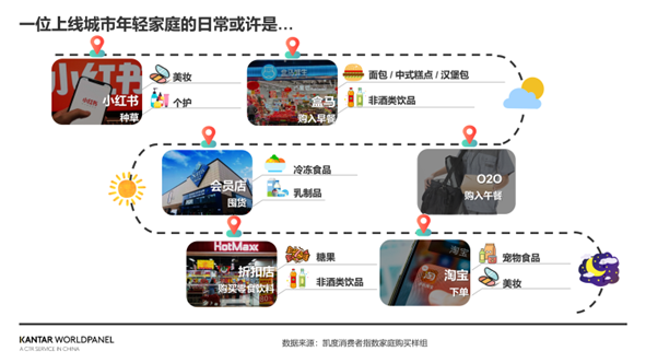 一位上线城市的年轻家庭成员的周末日常或许是:早上醒来打开小红书“种草”热门美妆个护新品,在电商平台间先行比价;赖床结束后,打开外卖APP挑选心仪的brunch及饮品;下午前往山姆等会员店采购冷冻食品、乳制品及休闲零食;晚上散步途中踏入好特卖大扫特扫;睡前仪式除了敷面膜外还需淘宝剁手心仪的化妆品并为宝贝宠物囤货,来结束充实的一天。