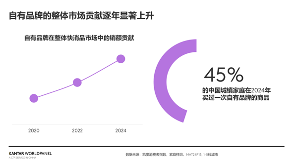 在中国市场,零售商们也纷纷发力自有品牌。可以看到自有品牌对市场的贡献度明显提升。消费者指数(Worldpanel)数据显示,自有品牌在消费者购物篮中的占比逐年增长,2024年有45%的中国消费者至少购买过一次自有品牌的产品。