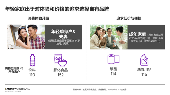 消费者指数(Worldpanel)研究显示,年轻单身族或夫妇,以及成年家庭是自有品牌的主力购买人群。这两群人购买自有品牌的需求存在差异:更年轻的年轻单身族或夫妇,偏好产品成分和消费体验的升级,往往会追求新奇口味和功能性的养生产品;成年家庭则更加追求性价比和便利性。