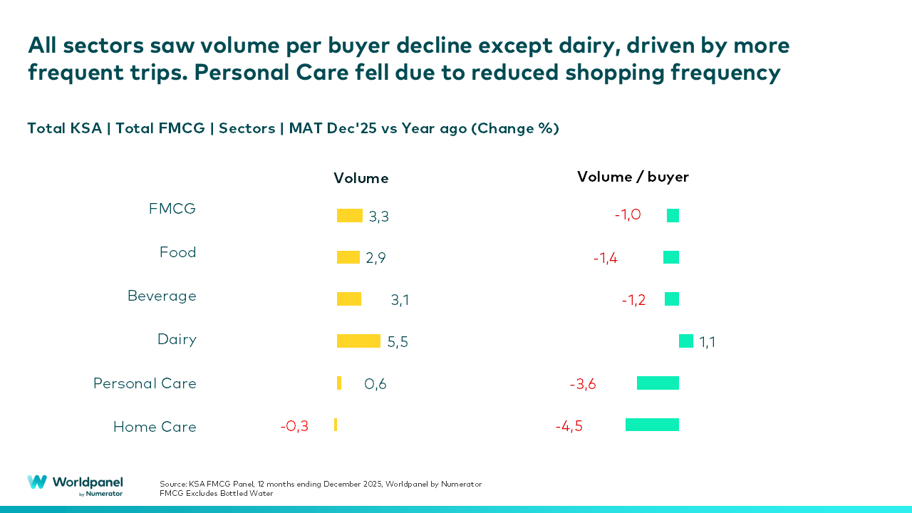 Across FMCG, consumers are buying less and spending less. Total volumes are supported by population growth, yet per buyer consumption has declined across almost all sectors except dairy, which remains resilient due to its essential nature and health relevance.