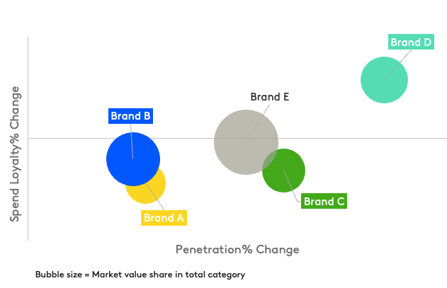 Take the example of Brands A, B, C, and E, which follow the typical pattern of growing penetration but declining spending loyalty. Brand D, however, stands out by increasing both penetration and loyalty. This raises critical questions for brands: should they focus on niche markets with fewer but highly loyal shoppers, or target a broader audience of heavy shoppers who buy more but are less loyal?
