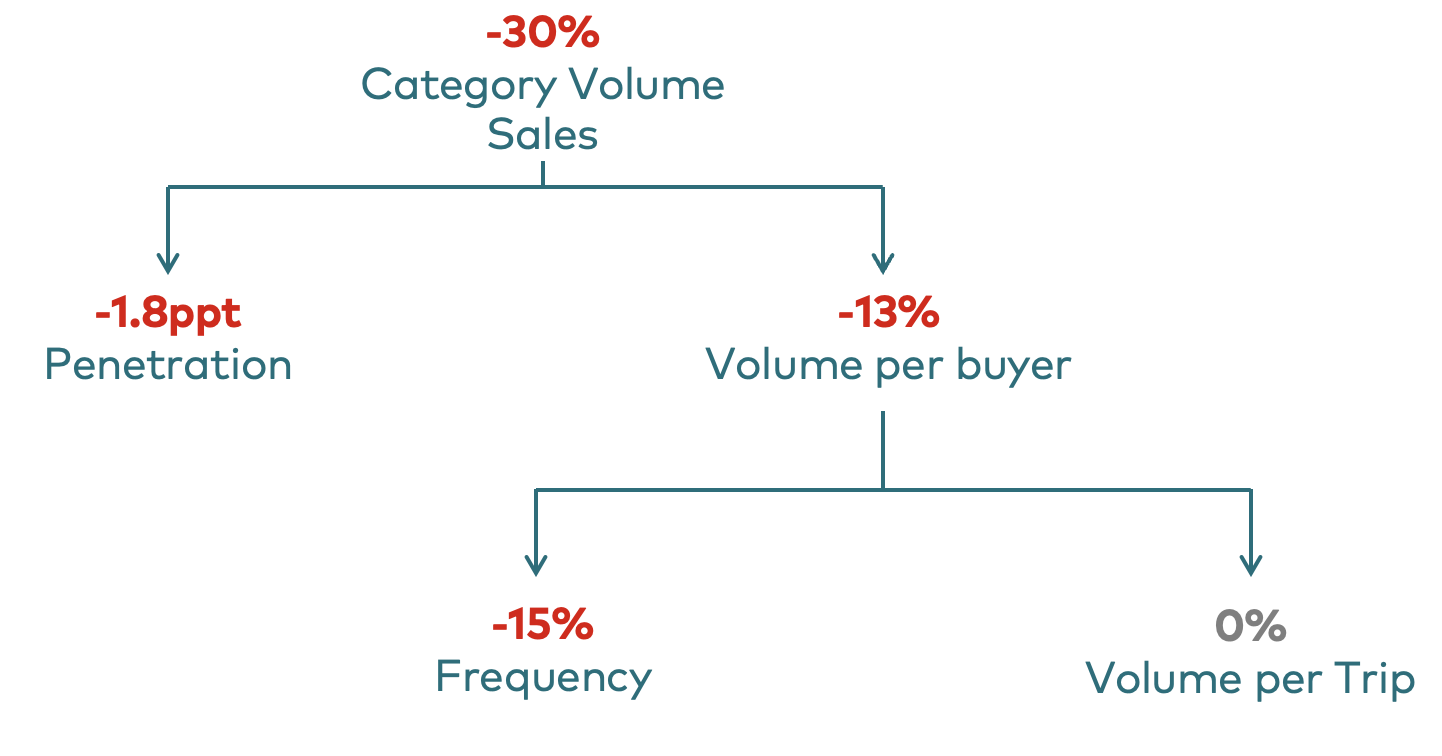 The decline is rooted in two critical dimensions: fewer households are choosing Brand A, and those who are buying are also less frequent. Penetration has dropped by 1.8 percentage points, indicating that the brand is losing relevance in the shopping repertoire of many consumers. Buy rate is also softening, with volume per buyer falling by double digits, driven by a reduction in purchase frequency. The top of mind by looking at these numbers: (1) not only are shoppers walking away from the brand, (2) even loyalist shoppers are scaling back their purchases.