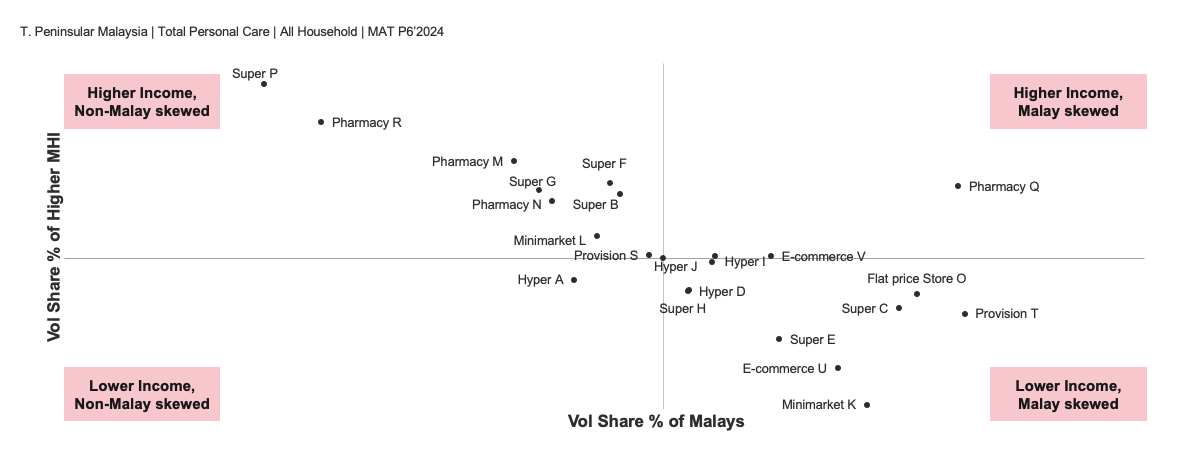 By mapping personal care retailers against volume share by ethnic group and household income, Brand A identified which retailers skew towards Malay and lower-income shoppers — in this case, those in the lower-right quadrant of the chart. This insight enabled them to strategically place smaller packs where they are most likely to resonate.
