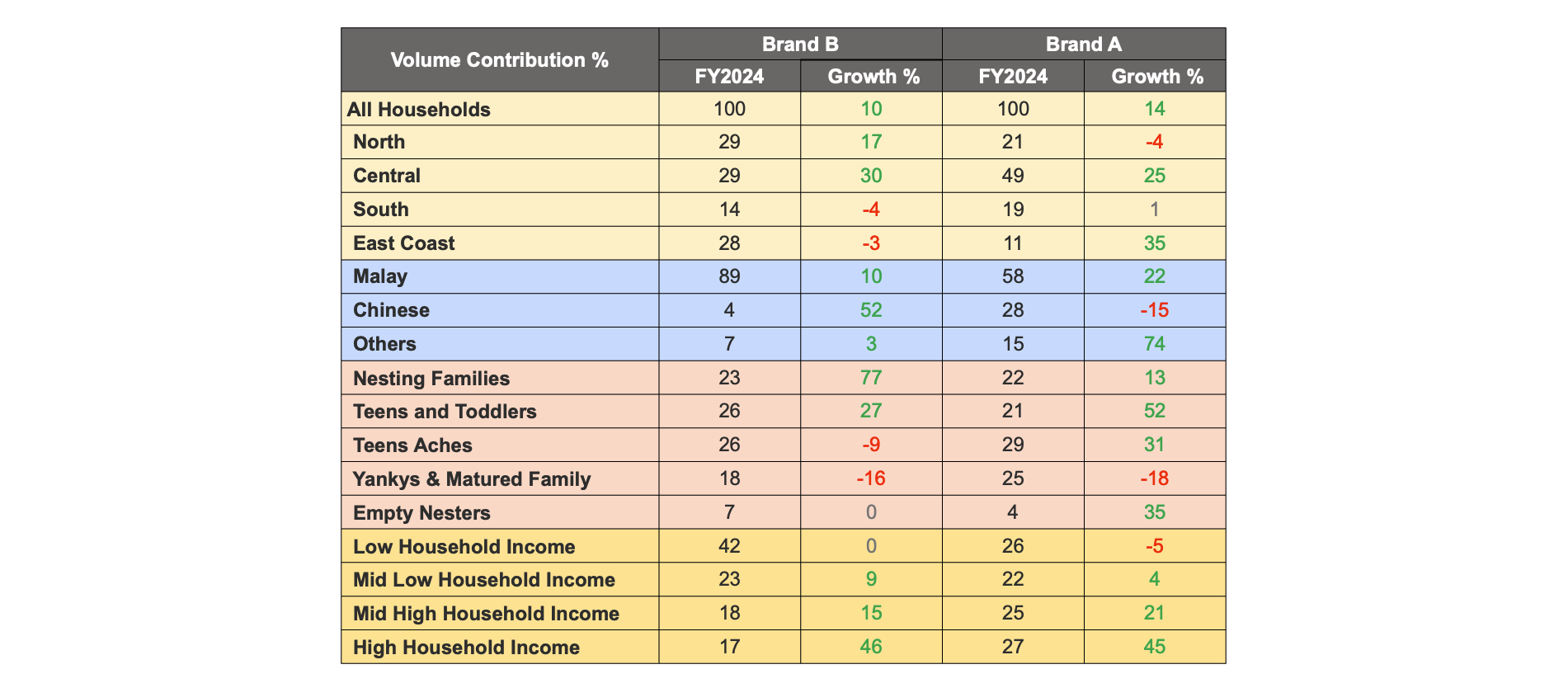 The next step was to conduct a deep dive into demographics to uncover potential growth opportunities for Brand A. We analysed and compared both brands’ performances across key demographics, including region, ethnicity, life stage, and household income. The findings reveal that Brand A is performing well and, in fact, is outpacing Brand B across most demographics. This analysis highlights that Brand A’s key growth opportunities lie in the North and Central regions, Chinese households, nesting families, and low to mid-income groups.