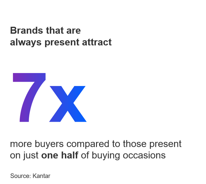- Be More Present - Optimise marketing investments to convert consumer predisposition and capture choices from other brands. Brands with strong equity that also activate well grow at 2.5x the rate of those with weaker activation.