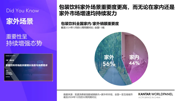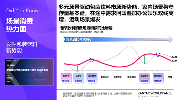 消费场景的多样化也为饮料市场带来新的机遇。凯度消费者指数最新包装饮料消费热力图中显示,2024年包装饮料前三消费场景为在家内、在途中和办公场所,且增长势头良好。但其背后增长驱动和消费诉求差异性非常明显。