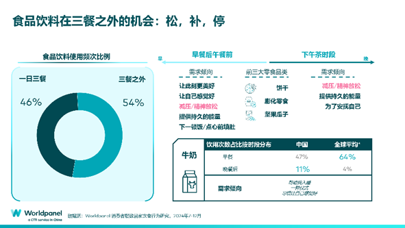 Worldpanel消费者指数数据显示,覆盖品类中80%处于频次上升通道,场景挖掘成为增长关键。“场”不再局限于传统“三餐早晚”,空白时段成为重要增量来源。Worldpanel消费者指数居家饮食行为研究显示,54%的食品饮料食用发生在三餐之外。零食类成为职场放松媒介,推动“办公室轻零食”、“通勤能量棒”等品类兴起。与全球相比较,牛奶在中国有11%于睡前饮用,由此催生“助眠奶”等新品类。场景的真正机遇在于结合时间与心理需求,创造新消费入口。