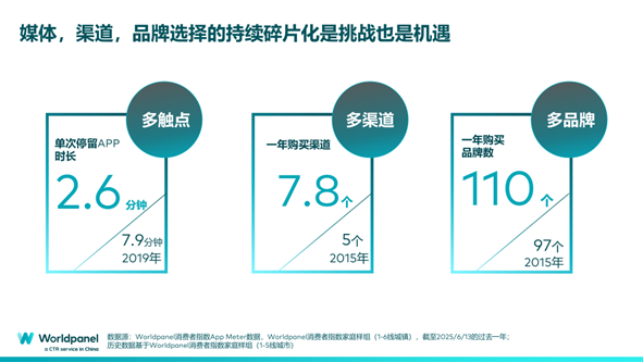 回看过去十年,快速消费品市场逐渐回归理性。Worldpanel消费者指数数据显示,消费者购物渠道从十年前的年均5个扩展至7.8个,家庭年均购买品牌数也从97个增加至110个,“碎片化、多元化”已成为常态。Worldpanel消费者指数中国区总经理李嵘强调:“需求的碎片化看似是困境,其实恰恰是新增长的起点。”