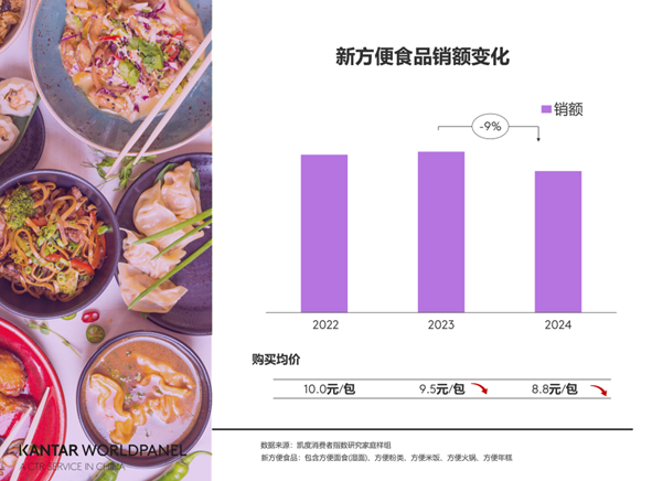 凯度消费者指数全国家内消费样组数据显示,渗透率已接近60%的中国新方便食品市场在2024年的销额同比下滑了9%,其中主要影响来源于购买均价的下滑。