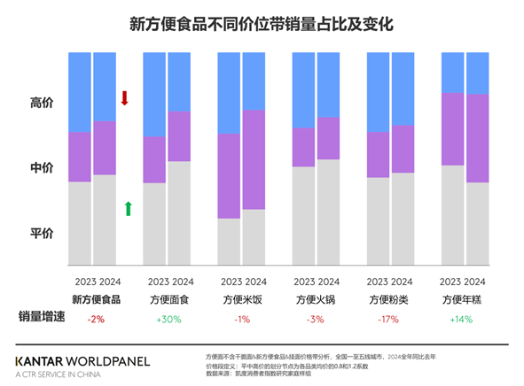 数据显示,新方便食品各子品类的高价产品(如单价20元以上的自热火锅、米饭等)销量下降显著,而平价产品逆势提升,尤其是在快速成长的方便面食类,其平价产品销量占比已接近50%。
